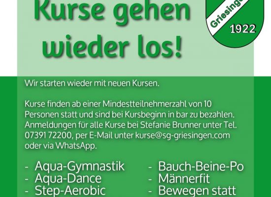 ❗️Info❗️Der Kurs Langhanteltraining ist bereits voll. Leider sind keine weiteren Anmeldungen mehr möglich. 🟢⚪ Neue Kurse starten wieder! ⚪🟢 Du willst fit werden oder einfach etwas für dich tun? Dann sei dabei! 💪 🗓️ Aqua-Gymnastik ab 15.09.2025 🗓️ Aqua-Dance ab 15.09.2025 🗓️ Step-Aerobic ab 17.09.2025 🗓️ Bewegen statt Schonen ab 17.09.2025 🗓️ Langhanteltraining ab […]