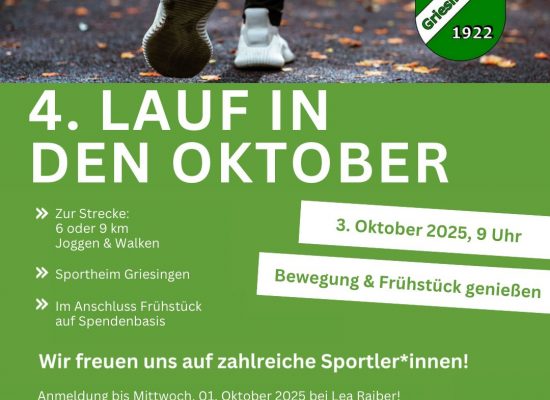 🟢⚪️ 4. Lauf in den Oktober⚪️🟢 Wir laden alle Sportbegeisterten auch in diesem Jahr wieder zum „Lauf in den Oktober“ der SG Griesingen ein: Gemeinsam bewegt in den Tag starten und im Anschluss ein Frühstücksbrunch genießen. Hast auch Du Lust darauf? Dann sei dabei! 🙌🏼 Details zur Veranstaltung: * 03. Oktober 2025 um 9 Uhr […]