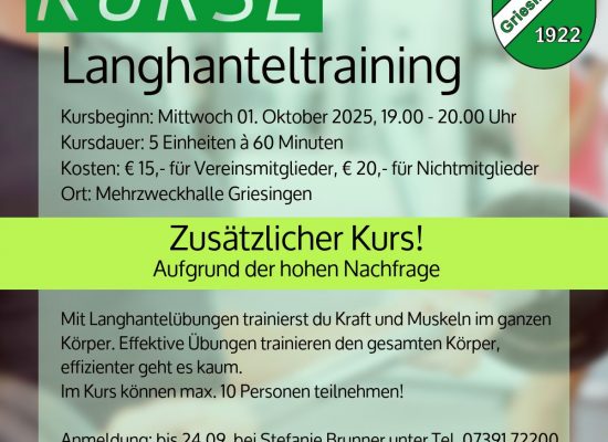 Aufgrund der hohen Nachfrage bieten wir einen zusätzlichen Kurs Langhanteltraining an! 📅 Start: Mittwoch, 01. Oktober 2025 🕖 Uhrzeit: 19:00 – 20:00 Uhr ⏱ Dauer: 5 Einheiten à 60 Minuten 📍 Ort: Mehrzweckhalle Griesingen 👉 Anmeldung bis 24.09. bei: Stefanie Brunner 📞 Tel.: 07391 72200 📧 E-Mail: kurse@sg-griesingen.com