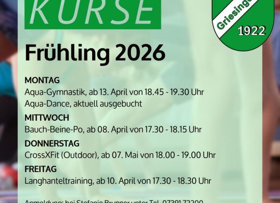 🟢⚪️Frühlingskurse 2026⚪️🟢 Gemeinsam mit der SGG fit und stark in den Frühling starten und direkt zu unseren Kursangeboten anmelden! 🏋🏽♀️🤸🏽♂️🧘🏽♀️ Die Kurse finden ab einer Mindestteilnehmerzahl von 10 Personen statt und sind bei Kursbeginn in bar zu bezahlen. Anmeldungen für alle Kurse bei Stefanie Brunner unter Tel. 07391 72200, per E-Mail unter kurse@sg-griesingen.de oder via […]