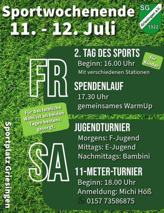🟢⚪️Jugendausflug der SG Griesingen! 🏌️‍♂️⚪️🟢 Für alle Kids und Jugendlichen der SG Griesingen von der 1. Klasse bis 16 Jahre! Am Samstag, den 13.09.25 geht’s los – wir machen einen Ausflug zur Minigolfanlage in Gamerschwang! ⛳ 📍 Treffpunkt: 14:00 Uhr an der MZH Griesingen 🍔 Essen & Eintritt übernimmt die SGG 🥤 Getränke müssen vor […]