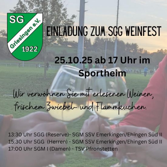 Liebe Weinfreunde, markiert den 25. Oktober im Kalender!🍇🍷 Die SGG, Abteilung Fußball lädt euch herzlich zum traditionellen Weinfest ein. Es erwarten euch erlesene Weine und leckere Speisen. Für gute Stimmung und Musik ist natürlich auch gesorgt🎶 Kommt vorbei, bringt Freunde mit und lasst uns gemeinsam anstoßen!🍷✨ Wir freuen uns auf euch! 🥳