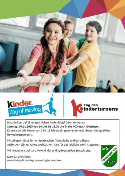 Der Tag des Kinderturnens ist eine bundesweite Aktion des Deutschen Turner-Bundes (DTB) und der Deutschen Turnjugend (DTJ) in Kooperation mit der Bewegungsinitiative kinder Joy of Moving. 🏃🙆🏼♂🤸🏻♀ Ziel ist es, Kinder für Bewegung und das Kinderturnen zu begeistern. Auch die SG Griesingen öffnet dazu am Sonntag, 09.11.2025 von 14 bis 16.30 Uhr die Türen der […]